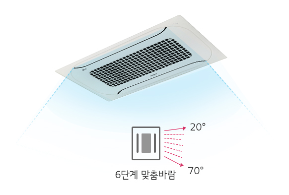 사용자의 위치에 따라 2개의 날개각을 20° ~ 70°까지 6단계로 컨트롤할 수 있어 실내환경과 생활에 따라 바람의 방향을 자유롭게 조절할 수 있습니다.
