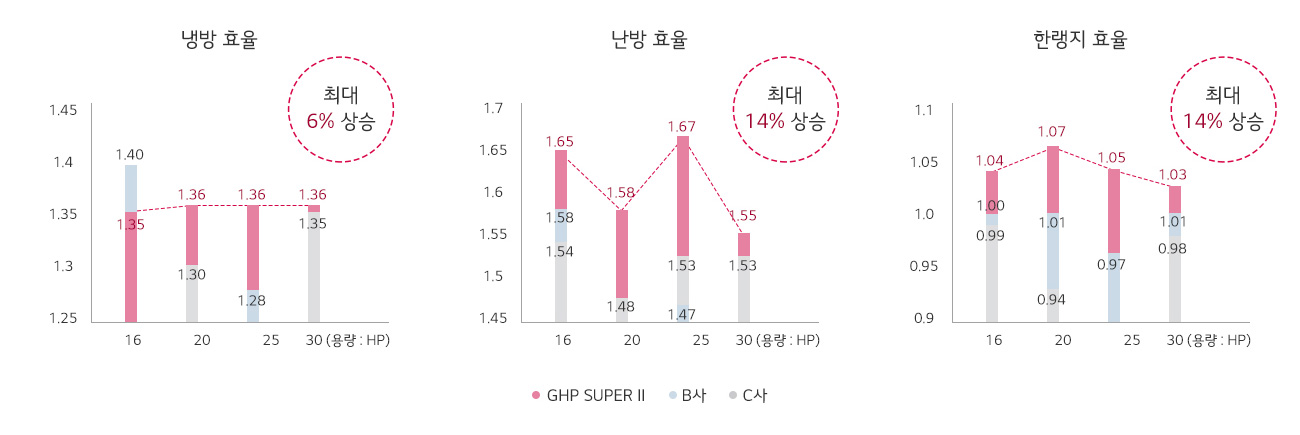 LG GHP SUPER II는 타사 대비, 전 모델 난방 및 한랭지 효율에서 최고 우위를 달성하였습니다. *고효율 에너지 기자재 인증서 기준('2015.12)