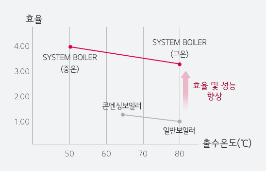 시스템보일러(고온)는 기존 보일러 대비 효율이 약 3배 높으면서, 80℃ 고온 출수가 가능한 제품입니다.