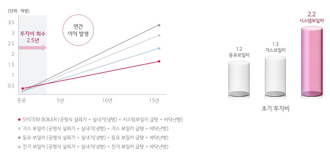 가스 보일러 대비 약 2.5년 안에 투자비를 회수할 수 있습니다.