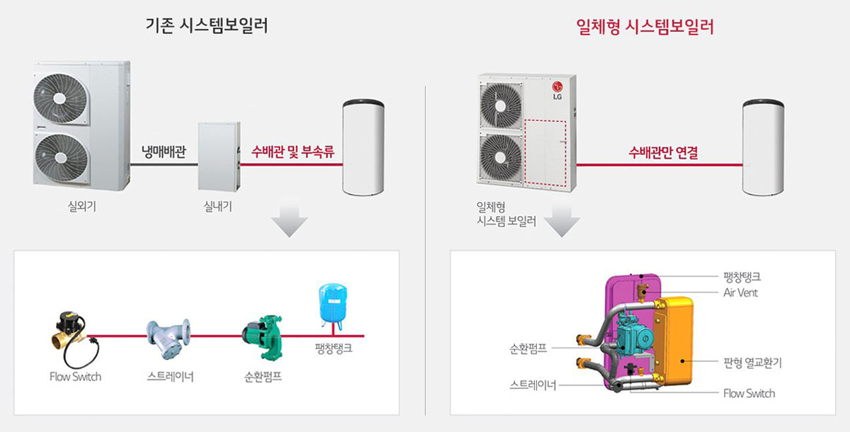 일체형 시스템보일러는 필수 수배관 구성 부품들이 포함되어 있으며,