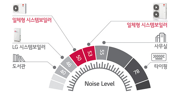 저소음 운전으로 보다 쾌적한 실내 환경을 만들어 줍니다. ※ 측정 및 운전 조건은 KS 규격에 따릅니다. ※ 소음 관련 Data는 설비 환경에 따라서 조금씩 차이날 수 있습니다.