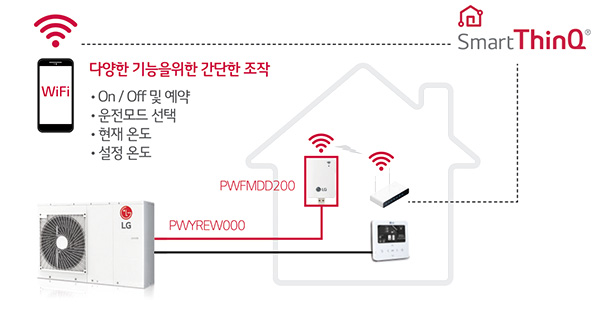 스마트폰과 같은 인터넷 장치를 사용하여 일체형 시스템보일러를 원격으로 제어 가능합니다. ※ 필수 액세서리 : PWFMDD200 (LG Wi-Fi 모뎀) 및 PWYREW000 (10m 연장 케이블은 일체형시스템보일러와 Wi-Fi 모듈 사이에 연결) ※ Search “LG Smart ThinQ” on Google market or Appstore then download the app.
